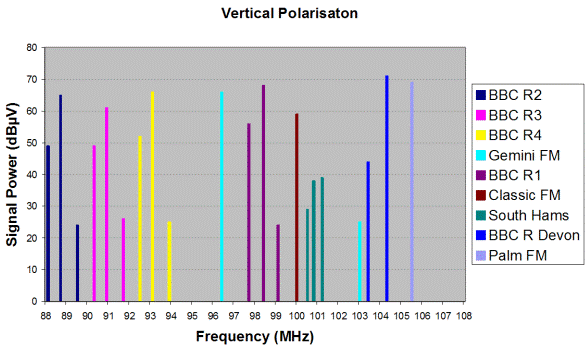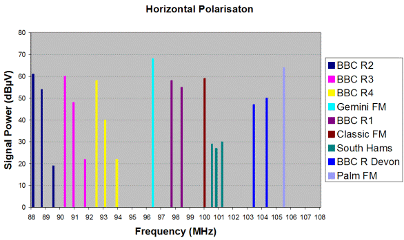 The following measurements show the signals that can typically be received on FM locally, together with the associated signal strength when using either a horizontally or a vertically polarised 3 element FM aerial:| Polarisation | ||||