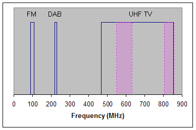 The following chart indicates the FM frequency range (88 - 108MHz), the DAB frequency range (217.5 - 230MHz) and the UHF TV frequency range (470 - 854MHz). The pink blocks indicate the spectrum that will be become free after the digital switchover: